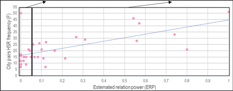 The potential linear relation between ERP and F based on analysed sample prove the strong correlation R=0.647. In case of extremes elimination, the correlation increases to R=0.852. However, to keep results transparent, the study is presented with extreme values and points to them. The correlation of results variates based on a different role of HSR operation in intermediate cities stations from 0.995 to 0.093 and from that point of view the universal application of Frequency estimation formula without considering the purpose of HSR introduction seems not probable.