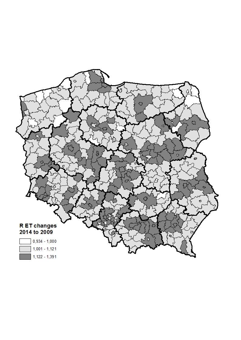 The problems related to sustainable development (SD) cover changes over time and space, as well as the interpenetrating relationships in economic, social, environmental, institutional and spatial spheres. The development, in line with the concept of sustainable development, takes place when all changes occurring in the environment are focused on improving the quality of life of the Earth’s population, following the principles of environment resources’ protection at the level allowing the development of future generations. SD concept remains one of the goals underlying developmental policies conducted at the global, EU, national and regional level. Therefore, the question arises how the developmental changes in one area manifest in others in the space of territorial units. The research was conducted for socio –economic areas, where through improvements in economic activity conditions, positive effects in areas of unemployment and poverty are expected. The analysed phenomena, described using indicators, are structured in accordance with the principle: from a problem to its solution, PSR (pressure‑state‑response). Methodology of the SD evaluation in the PSR framework is based on aggregate measures, correlation analysis, spatial statistics and macro evaluation of changes using `change matrix’. The analysis was carried out for the panel of data referring to the poviats in Poland in the period 2009–2014.