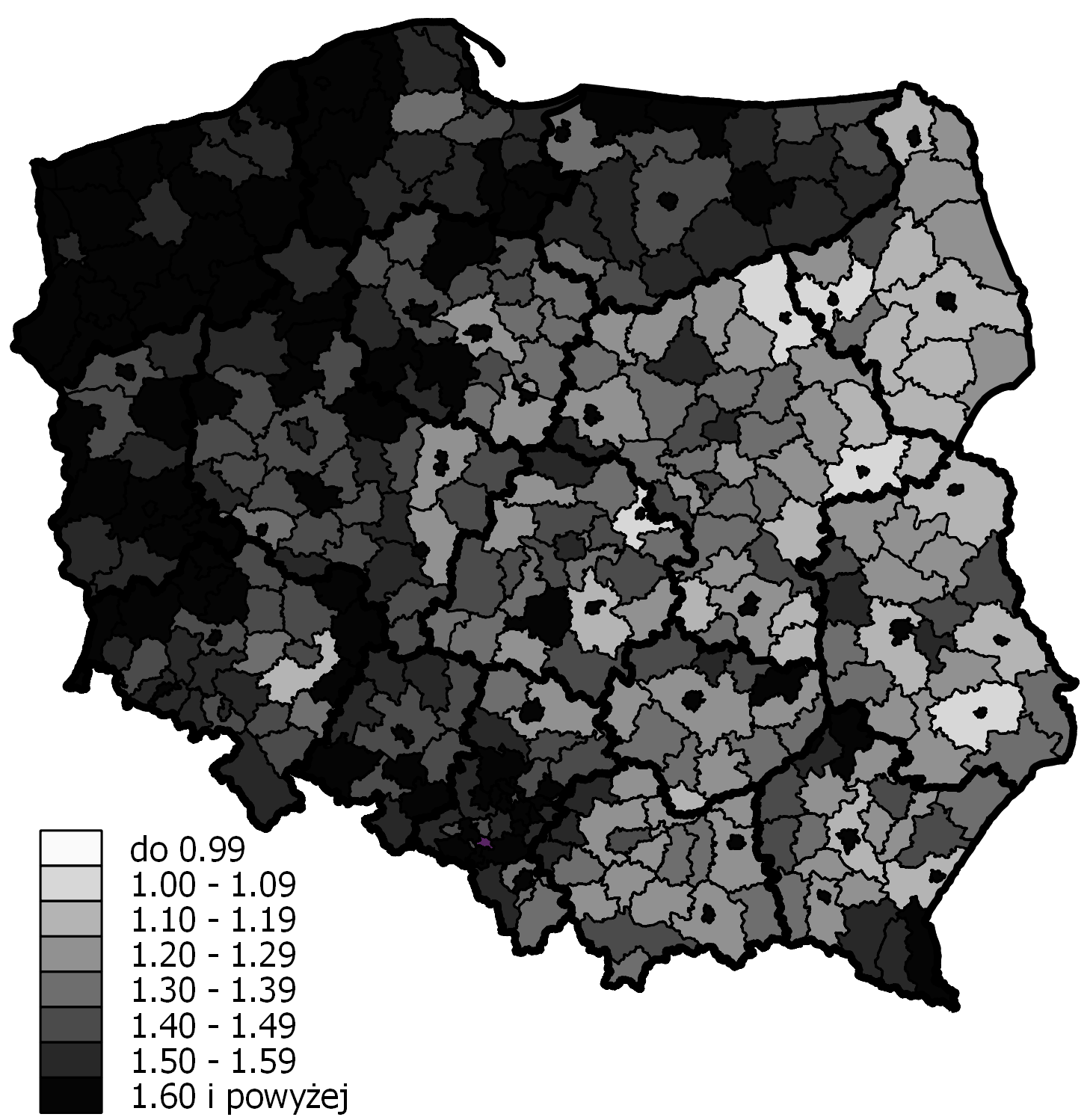 - Ryc. 7 Odsetek ludności w wieku 65+ lat w powiatach w 2002 r. (Język polski)