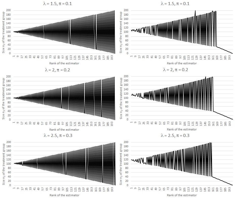 - Relationship between size n_2 and rank of estimator regarding its RMSE for moment (left) and ML (right) estimators and different set of model parameters.