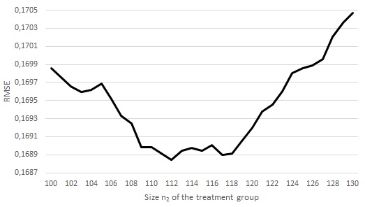 - Exemplary quadratic interpolation (dotted line) on the fragment of the root mean square error of ML estimators (solid line) for λ=2 and π=0,2 based on the results corresponding to the treatment group sizes: 96, 112 and 128 (black dots).
