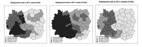 The article analyses the employment characteristics. The employment rate was studied in selected regions of Europe, and subsequently, for selected variables: total population employed, women employed and men employed, classic econometric models were constructed and the necessity of including the spatial factor in the process of modelling was verified. The demographic variables and GDP per capita were chosen as explaining variables of the model. It was analysed whether including a spatial approach in the models would improve their quality. Two basic spatial models were taken into consideration: the spatial error model and the spatial lag model, the former of which turned out to be the right tool for the analyses.