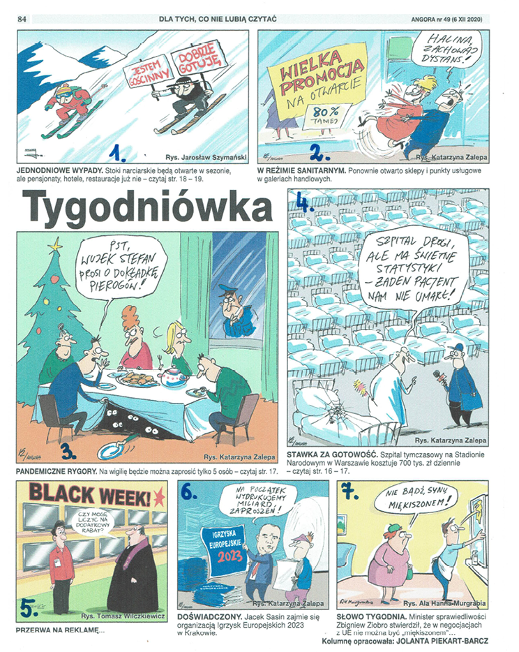 Die im Weiteren besprochenen Witze aus „Tygodniówka“ wurden durchnummeriert. Als Einführung in die Analyse dient der Scan der kopierten letzten Seite der Wochenzeitschrift „Angora“ vom 6. Dezember 2020, auf der zusätzlich die Witze mit den Nummern versehen wurden.