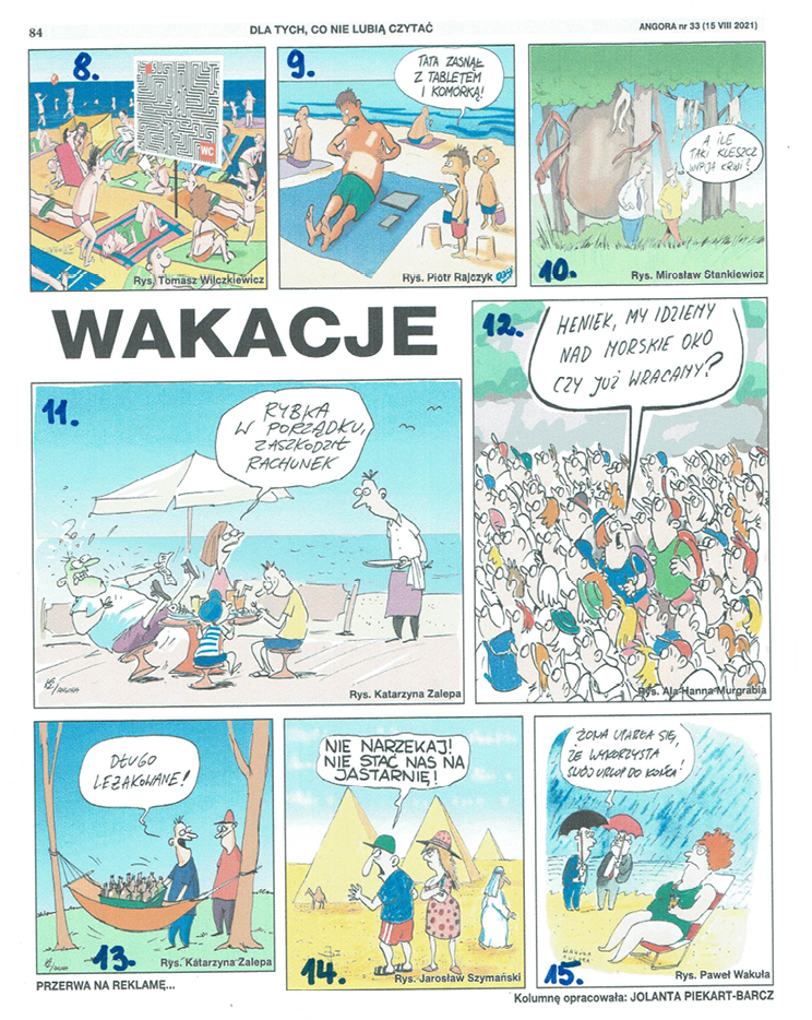 „Tygodniówka“ aus der Ausgabe 33/2021 heißt „Wakacje“ wegen der Sommerferien, in denen „Angora“ erscheint. Die Zeit der Erholung und des Urlaubs zeigt die Veränderung der Einstellung der Menschen zur Pandemie. Auch in diesem Fall wird zuerst die gescannte Kopie der letzten Seite von „Angora“ vom 15.August 2021 mit den für die Zwecke der Analyse aufgetragenen Nummern der Witze präsentiert.