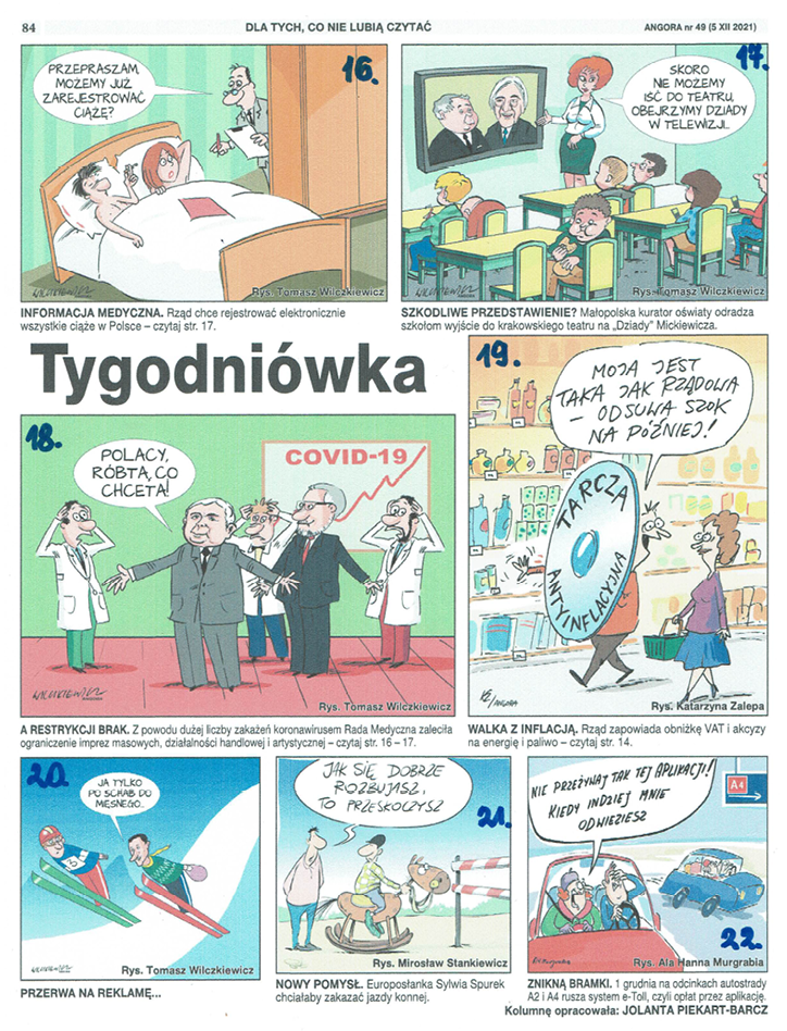 „Tygodniówka“ aus der Ausgabe 49/2021 wird mit dem Witz über die eingeführte Handy-App beendet, mit der für die Fahrt auf der Autobahn A4 gezahlt werden kann. Der Leser sieht hier einen Mann am Steuer und neben ihm vermutlich seine Schwiegermutter/Mutter/Ehefrau. Sie versucht ihn zu trösten, weil er höchstwahrscheinlich diese App in seinem Handy noch nicht installiert hat und Probleme hat, sich frei auf der Autobahn fortzubewegen und seine Beifahrerin nach Hause zu bringen: „Nie przeżywaj tak tej aplikacji! Kiedy indziej mnie odwieziesz.“ („Denk nicht die ganze Zeit an diese App! Du bringst mich an einem anderen Tag nach Hause.“, e.Ü.). Die versteckte Botschaft betrifft die nicht selten komplizierten Relationen Schwiegermutter – Schwiegersohn, Mutter – Sohn oder Ehemann – Ehefrau.