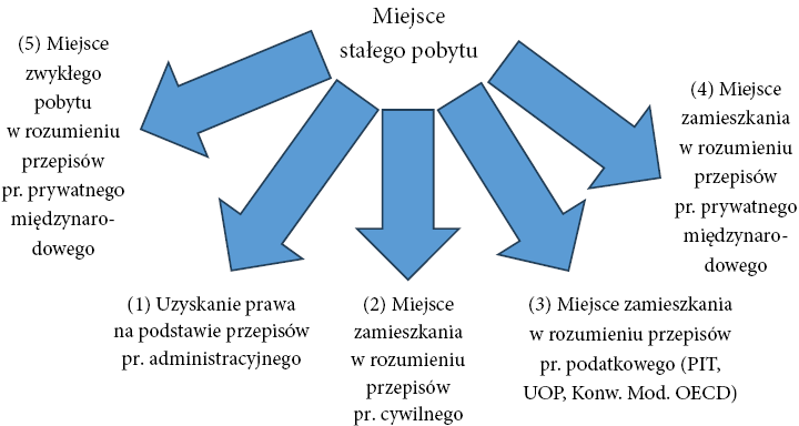 Analiza piśmiennictwa pozwala dodać do powyższego schematu czwartą i piątą alternatywę, tj. możliwość rozumienia zwrotu „miejsce stałego pobytu” zgodnie z treścią, jaką nadaje się pojęciom „miejsce zamieszkania” i „miejsce zwykłego pobytu” w prawie prywatnym międzynarodowym.