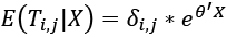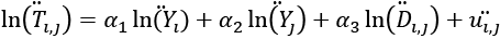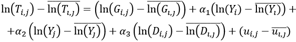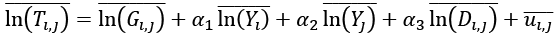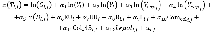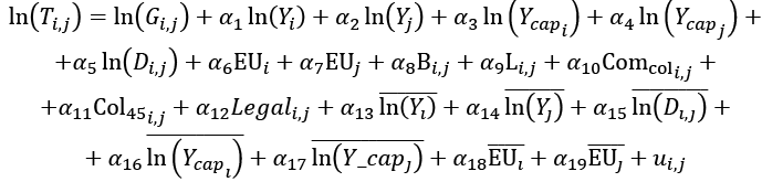 gdzie δi,j to efekt stały (por. stałą grawitacyjną dla połączenia handlowego), θ to wektor współczynników, a X to wektor niestałych w czasie zmiennych objaśniających.