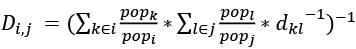 Di,j – dystans między państwami ważony populacją,