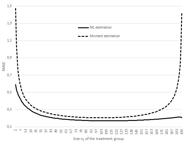 - Comparison of the root mean square error (RMSE) of estimators for moment estimation (dotted line) and ML estimation (solid line) for λ=2 and π=0,2.