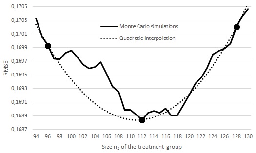 - Exemplary quadratic interpolation (dotted line) on the fragment of the root mean square error of ML estimators (solid line) for λ=2 and π=0,2 based on the results corresponding to the treatment group sizes: 96, 112 and 128 (black dots).