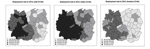 The article analyses the employment characteristics. The employment rate was studied in selected regions of Europe, and subsequently, for selected variables: total population employed, women employed and men employed, classic econometric models were constructed and the necessity of including the spatial factor in the process of modelling was verified. The demographic variables and GDP per capita were chosen as explaining variables of the model. It was analysed whether including a spatial approach in the models would improve their quality. Two basic spatial models were taken into consideration: the spatial error model and the spatial lag model, the former of which turned out to be the right tool for the analyses.