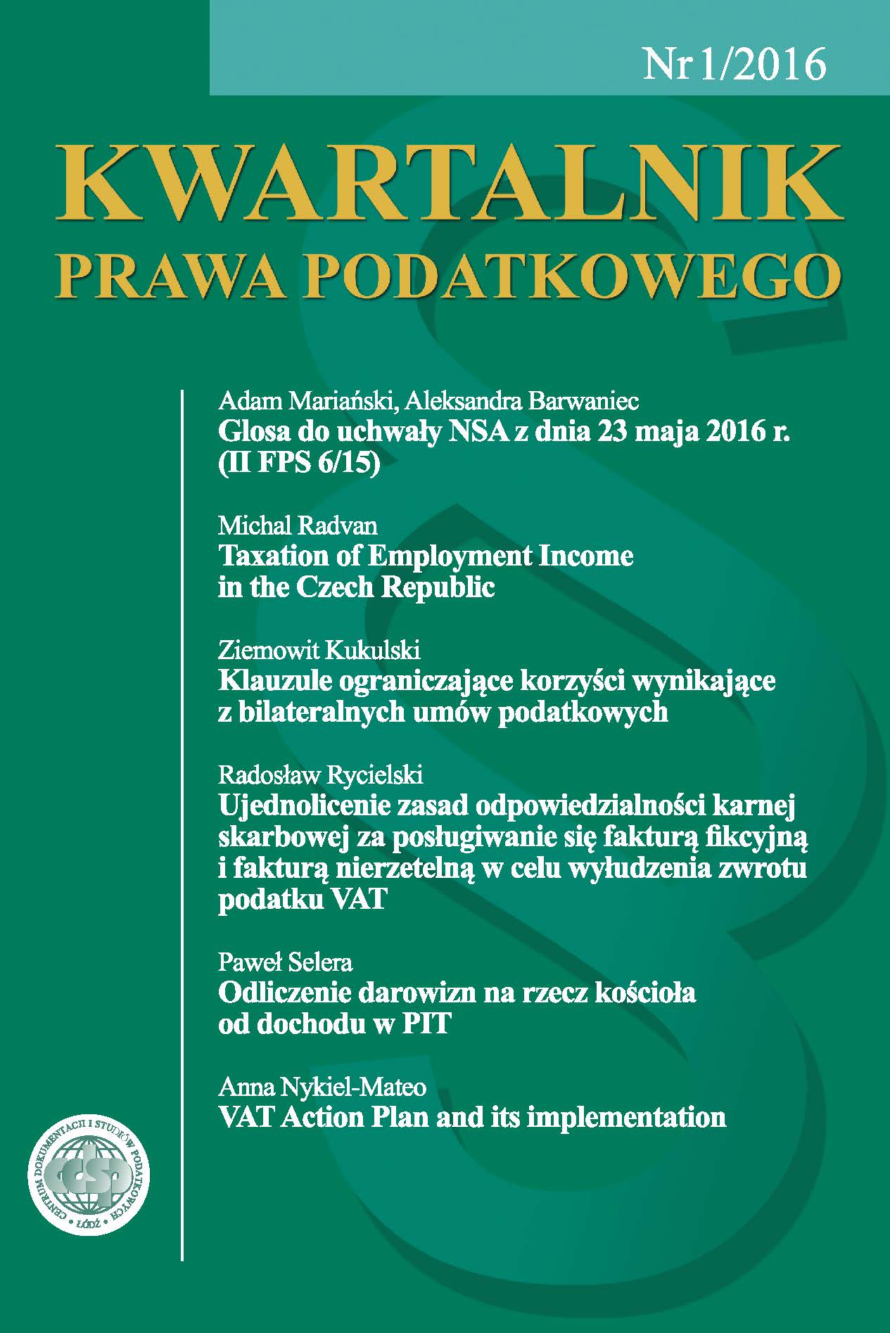 The article concerns the rules of fiscal penal responsibility for using unjust and fictional invoice with the purpose of wheedling tax return. There was taken into consideration most recent judicature referring to the issue of unifying of this responsibility. As results from it, the distinction between unjust and fictional invoice has no meaning in terms of dimunition of State Treasury income, because the intention of violator (as to issuing both ujnust and fictional invoice) leads in consequence to dimunition the public income and therefore there’s no practical meaning in this distinction, because these two types of invoice are the the documents against the actual state. The article concerns also the issues related to avoiding the fiscal penal responsibility for issuing of fictional invoice.